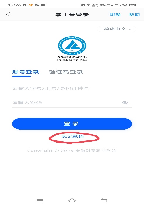 1.点击今日校园左下角“学工号”,点击“忘记密码”按钮