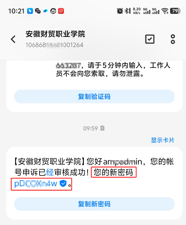 3.申诉审核通过后即可收到新密码的短信并自动将已绑定手机号更换为新登记号码