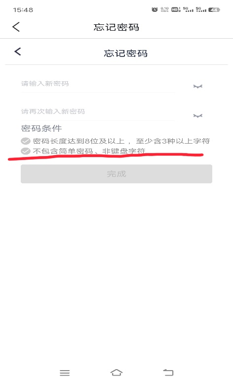 3.输入绑定的手机号并填写验证码,通过后按照密码要求输入新密码,点击 “完成”即可完成密码重置。重置后可使用新密码重新登陆
